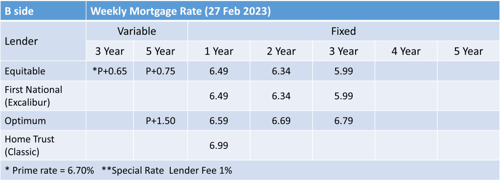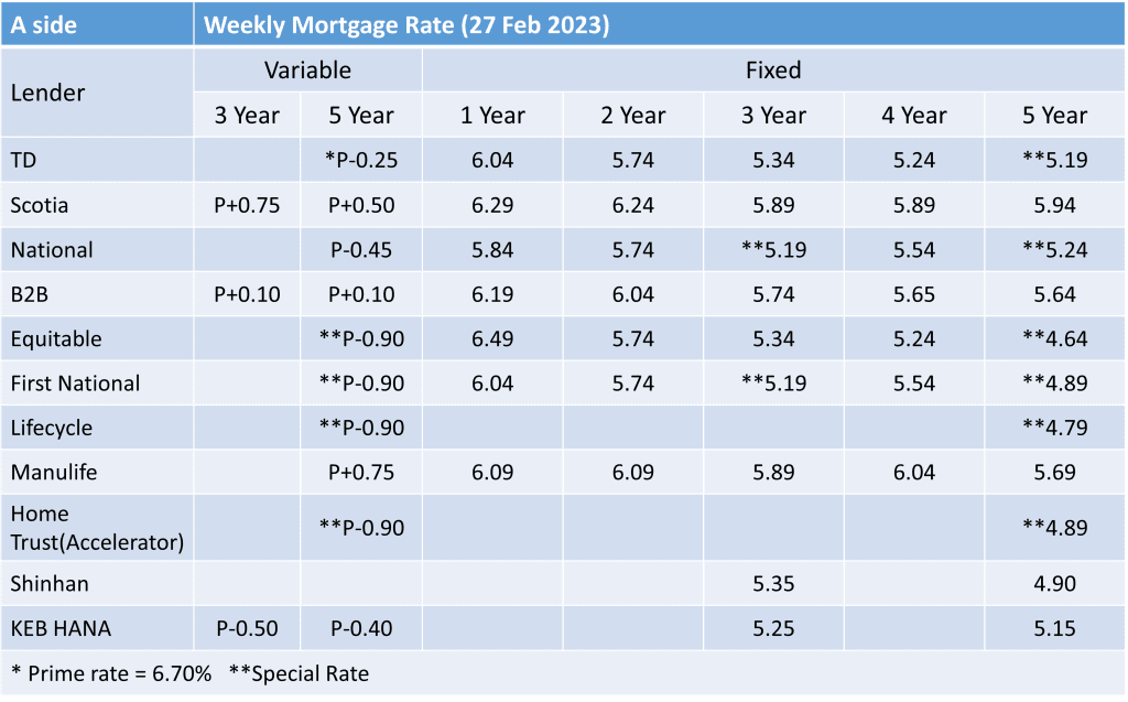 Mortgage Rate 모기지 금리 – 27 Feb. 2023 1 March 2023 1 March 2023 Data Source: Kyu Sun Lee (JP Mortgage Services) (이규선 모기지)Cell: 1-647-980-6840